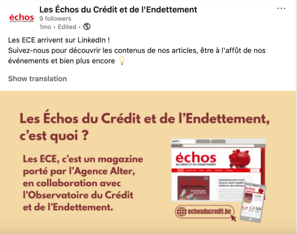 Pour permettre plus de visibilité aux Echos du crédit et de l’endettement, notre chargée de communication est désormais chargée de relayer notre actualité sur LinkedIn. Avec une mise en avant de nos dossiers et des posts réguliers pour mettre en avant les articles dans chacune de nos publications trimestrielles.